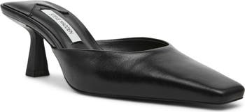 A squared-off toe and sculptural flared heel bring eye-catching appeal to this leather mule showcasing a slightly asymmetric profile.