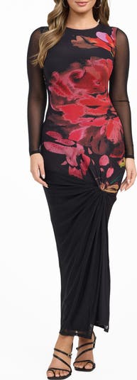 Sheer sleeves frame this stretch-kissed maxi made from gauzy mesh and adorned with abstract blooms. A twisted-and-gathered skirt shapes this charming silhouette.