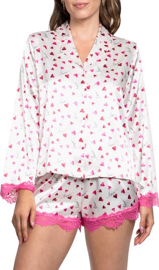 Slinky, whisper-light satin covered in watercolor hearts dials up the romance in these lace-trimmed pajamas featuring a boxy button-up and matching shorts.