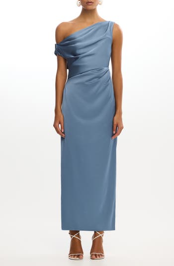 Sharp pleats texture and shape this glamorous evening-out gown made with a satiny sheen and finished with a drapey dipped back.
