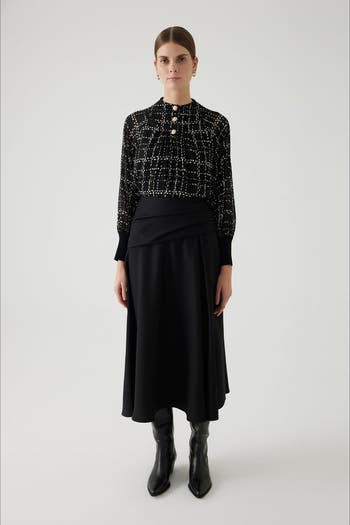 The Slit Pleated Lined Skirt combines pleated movement. It moves comfortably and pairs easily with both casual and polished tops. It pairs easily with simple knits, shirts, or blouses for both casual and polished dressing.