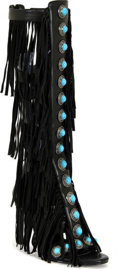 Fringe trim and polished cabochons make a Western-inspired statement on this knee-high sandal.