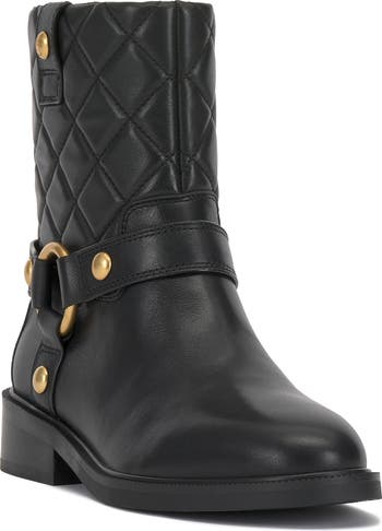 A quilted shaft and studded hardware bring moto edge to a casual-favorite boot shaped from smooth leather.