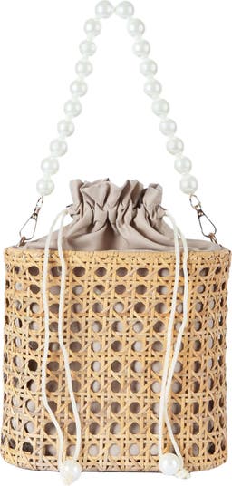 Woven rattan brings earthy texture and summery style to a chic tote crafted with an interior drawstring bag and a removable beaded shoulder strap.