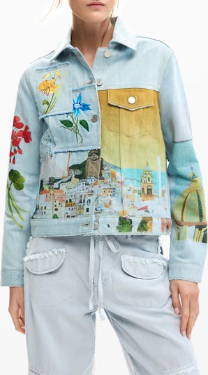 The majesty of the Amalfi coast inspires this scenic trucker jacket detailed with embroidery, patchwork and prints.