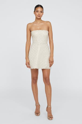 A strapless mini dress in allover beaded lace, finished with a scalloped edge at the neckline and hem. Designed with a flattering bell-shaped silhouette and inner crinoline for added volume. An easy yes for bridal showers, rehearsal dinners, or the afterparty.