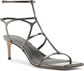 Slender strips of metallic leather create the striking cage silhouette of a statement-making sandal designed with a modest heel and slanted square toe. A gleaming, graphite-inspired hue clinches the contemporary impact of this Italian-crafted style.