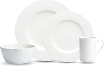 - Includes four dinner plates, four salad plates, four coupe bowls and four mugs