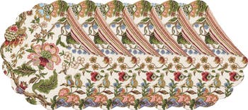 The Amara quilted tabletop collection features a traditional floral and Jacobean pattern in bold botanical colors of green, red, brown, yellow, and blue tones. The scallop-edge table linens reverse to a coordinating stripe pattern for additional styling options. Available as a napkin, placemat, round placemat, and runner. Love this pattern? Amara is also available as a bedding collection.