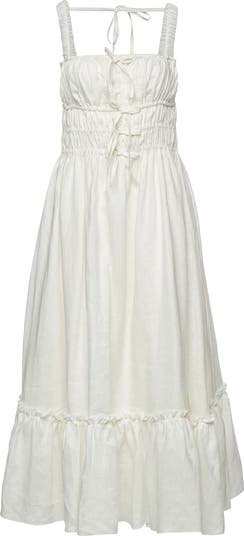 The Amara ruched dress is crafted out of pure organic linen of the finest quality and showcases tiered elasticated ruching on the bodice and a deep back with self ties. Style it with flat sandals, straw bag and minimal gold jewellery.