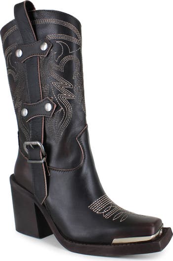 A snipped toe boasting a gleaming hardware plate refreshes the classically Western design of a water-resistant cowboy boot detailed with bold topstitching and buckled side straps.