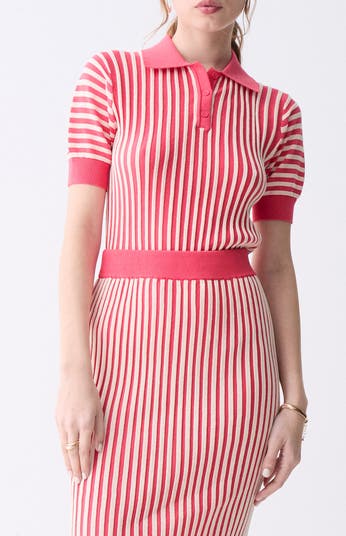 Zippy vertical stripes run up and down a lightweight polo-sweater framed by puff sleeves to sweeten the sporty look.