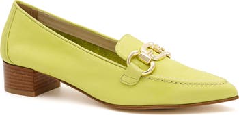 Gleaming chain-link hardware enriches the loafer-inspired upper of a pointy-toe pump set on a cushioned footbed and slip-resistant sole.