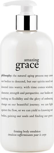 What it is: A firming body emulsion infused with the amazingly clean, beautifully feminine scent of philosophy’s best-selling amazing grace fragrance.