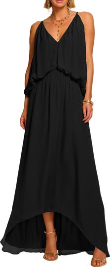 A blouson bodic and a flowy fit define a vacation-ready maxi cut from a lightweight fabric.