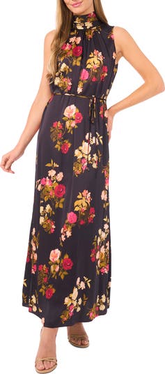 Rich vintage-inspired blooms romance this sleeveless maxi cut from satin and made with ties at the back and waist to shape the silhouette.