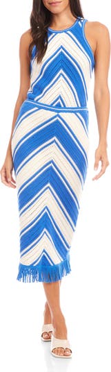 Airy crochet stitching brings a homemade look and feel to this figure-skimming midi skirt knit in a vibrant chevron pattern for an energizing vibe.