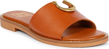 Horseshoe-inspired hardware and a geometric cutout enrich the instep of a sleek leather slide sandal that will complement your weekend-ready looks.