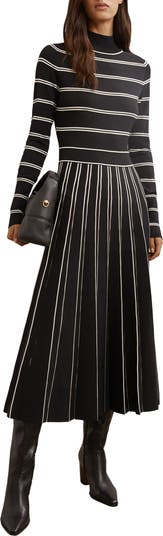 Long sleeves frame this pleated midi dress featuring crisp, directional stripes and a flared skirt.