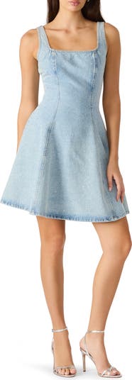 Glittery dots add subtle shimmer to a nonstretch-denim minidress in a classic skater silhouette.