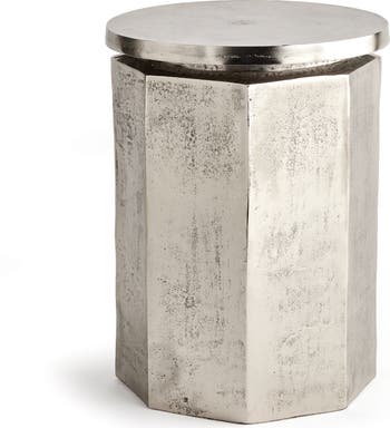 Hexagonal in shape with a tapered neck and round top, this stool is a unique accent. Antiqued silver blackened grooves give it Depth and interest. Tuck under console table or place along the wall for added seating.