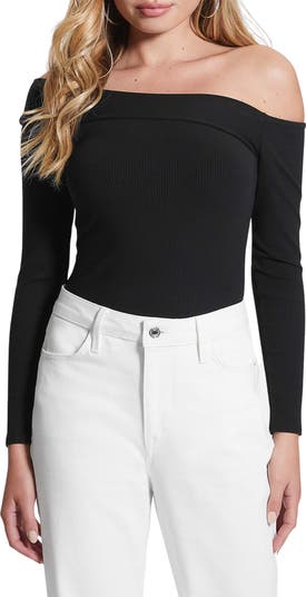Show off a bit of shoulder in this curve-hugging long-sleeve top made from a stretchy ribbed knit.