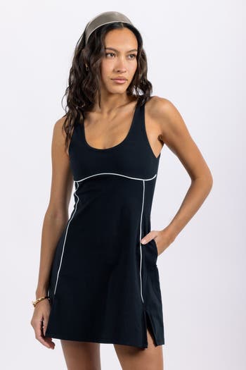 A fashion-forward tennis dress crafted from signature brushed UPF50+ fabric, featuring a flattering scoop neck, contrast piping, and functional liner shorts with pockets.