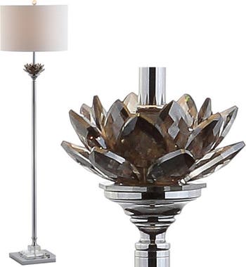 - Smoked crystal lotus accent on chrome floor lamp base adds Eastern influence to a classic silhouette