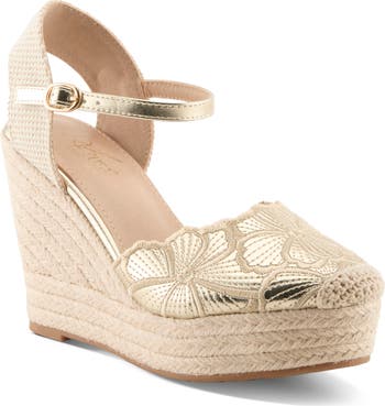 An espadrille-style platform wedge brings summery texture and towering height to a stunning shoe detailed with metallic flowers at the toe.
