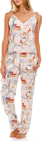 A lively nature print gracefully details these soft and lightweight linen PJs that pair a cute camisole with side-piped bottoms.