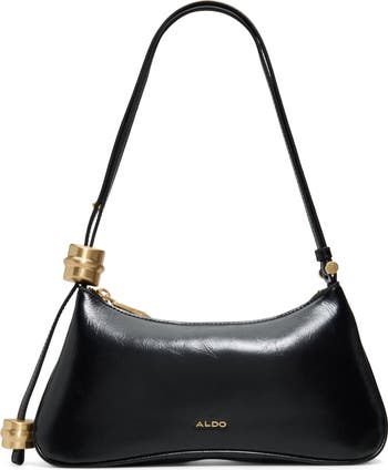 Glinting hardware highlights the sleek faux-leather exterior of a slender shoulder bag suspended from an adjustable strap for customized styling.