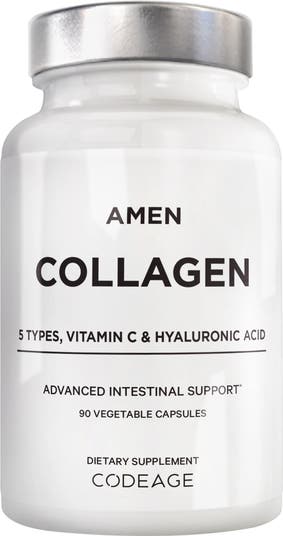 - Amen Collagen capsules supplement includes 5 types of collagen (Type I, II, III, V, and X) in one formula. The collagen comes from premium sources, including grass-fed hydrolyzed bovine collagen peptides, organic chicken bone broth collagen, and eggshell membrane collagen. This product is free from shellfish.