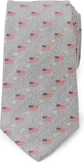 Add a patriotic touch to your ensemble with a soft cotton tie woven with American flags, tonal stars and herringbone stripes.