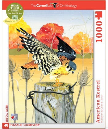 Roughly the size and shape of a Mourning Dove, North America’s littlest falcon packs a predator’s fierce intensity into its small body. It’s one of the most colorful of all raptors; the male’s slate blue head contrasts elegantly with a rusty-red back and tail. Hunting for insects, small rodents, and birds in open territory, kestrels perch on wires or poles, or hover facing into the wind, flapping and adjusting their long tails to stay in place. Kestrels are declining in parts of their range, but you can help them by putting up nest boxes.\r\n\r\nThe Cornell Lab of Ornithology has developed QR codes which allow you to listen to the songs and calls of hundreds of birds, right from your smart phone. We have harnessed this educational technology to allow you to hear these birds sing while completing your puzzle. The QR code is on the back of the box.