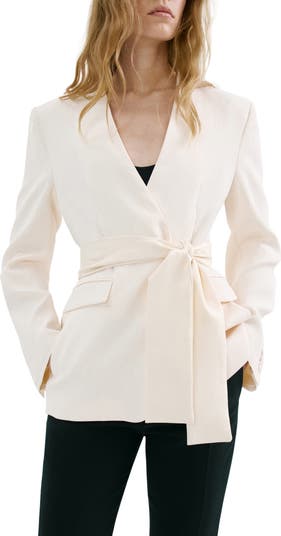 Strike a modern mood in a collarless jacket offered with a matched scarf to dial up the drama.