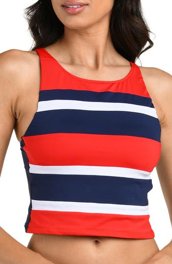 Mixed stripes give a coastal vibe to this curve-hugging tankini topped with a sporty high neck.