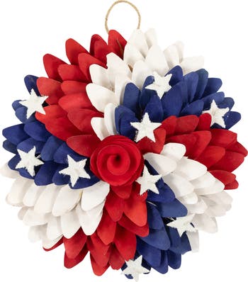 Celebrate your patriotic spirit on Independence Day with this artificial wreath. Perfect for any occasion from Memorial Day to the Fourth of July, this eye-catching wreath showcases vibrant red, white, and blue petals with a red rose. It is accented with white stars. Hang it on your front door this July 4th or use it as a centerpiece to add a touch of patriotism to your celebrations. Product Features: Unlit Americana artificial wooden petal decoration Red, white and blue design Accented with a wooden red rose and shimmering white stars Comes ready to hang on a jute twine cord Flat foam backing Recommended for indoor use - if using outdoors place under a covered area Dimensions: 12"H x 12"W x 3.25"D Material(s): wood/foam/paper