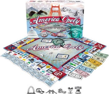 Americaopoly is a game that celebrates our great nation. Buy properties such as the Golden Gate Bridge Route 66 the Statue of Liberty the Grand Canyon or Niagara Falls. Collect Homes and trade them in for Estates. Land on the Fourth of July and scoop up the cash from the center of the board. Pick up $200 each time you pass GO U.S.A. but beware you may end up in a traffic jam and lose three turns. Or worse yet be audited by the IRS. Whatever happens Americaopoly is good ol' American fun for family and friends.