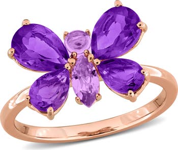 This enchanting butterfly ring features amethyst and pink amethyst gemstones set in a beautiful rose flash-plated sterling silver band. The vibrant purple hues of the amethyst and the soft lavender tones of the pink amethyst gemstones create a stunning contrast, while the butterfly design adds a whimsical and romantic touch. The rose plated sterling silver enhances the colors, giving the ring a warm, elegant finish. A perfect, charming piece to add to any jewelry collection.