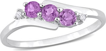 Adorn your hand with the regal color and exceptional sparkle of this amethyst and diamond three-stone ring. Crafted in radiant 10k white gold, the ring features a magnificent amethyst center stone, showcasing a deep, vibrant purple hue. This commanding centerpiece is brilliantly flanked by two sparkling diamonds, which enhance the overall fire and light. This piece offers a beautiful and sophisticated contrast between the rich color of the amethyst and the enduring brilliance of the diamonds, making it a timeless symbol of luxury and elegance.