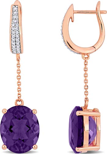 Exude elegance and charm with these breathtaking amethyst and diamond drop leverback earrings, featuring 2 oval-shaped amethyst gemstones that dazzle with their regal lavender hue. Suspended in warm 14K rose gold, each amethyst is adorned with sparkling diamond accents, adding a touch of brilliance and enhancing the gemstone's natural beauty.