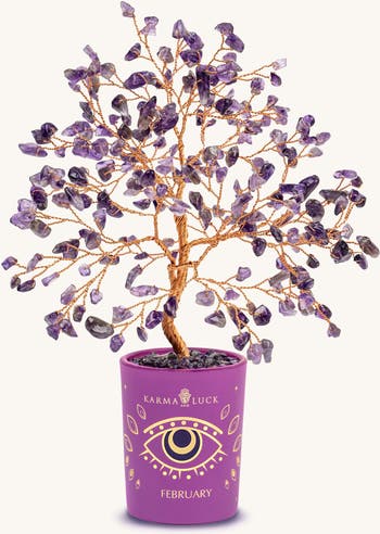 Blessings abound for all who lead with a caring heart. Specially designed for all the warm and supportive souls born in February, this beautiful birthday tree is adorned with Amethyst leaves and is painted with an Evil Eye for added protection. Amethyst, the stunning birthstone of February, is beloved for its soothing qualities and its serene nature - much like the people born in this winter month. Keep your loved one swimming in peace and calm by gifting them the “Compassionate Vibration Amethyst February Birthday Tree.”