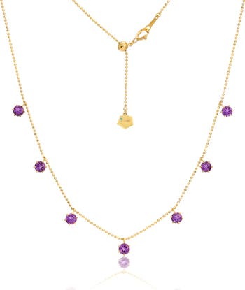 Gemstone: 2 Carats of Amethyst (7 pcs) Metal: 18K Gold, 3.35 Grams Colors: Yellow Gold Measurements: 18" Adjustable Bolo Closure: Spring Ring