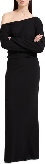 A brushed-rib jersey maxi dress is made in a shoulder-showing silhouette with a flowy, floor-grazing skirt for a look that is simple yet glamorous.