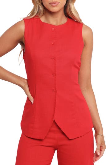A streamlined silhouette with clean lines brings an air of sophistication to this linen-enhanced vest with a martingale belt in the back.