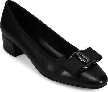 Glinting hardware centers a grosgrain bow on a streamlined leather pump featuring a cushioned footbed and low block heel for walkable comfort.