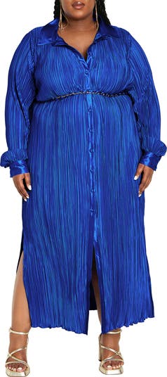 Shimmering plissé pleats elevate this refined shirtdress finished with satin trim and graceful side slits.