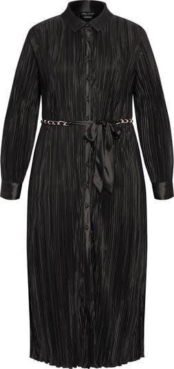 Fine allover pleats texture this polished shirtdress cut from rich satin and centered with a defining chain belt.
