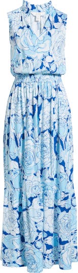 Bold flowers bring signature fun to a versatile maxi designed with a smocked waist and sleeveless blouson-style bodice.