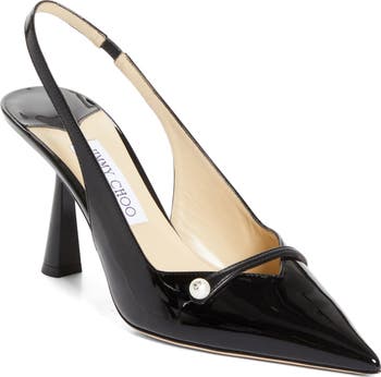 A slim strap punctuated with a logo-embellished faux pearl highlights the pointy toe of a slingback pump set on an architecturally tapered heel.